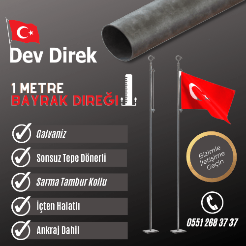 Dev Direk tarafından üretilen paslanmaz ST37 galvaniz bayrak direkleri sağlam, uygun fiyatlı ve uzun ömürlü be korozyona dayanıklıdır. Galvanizden imal ettiğimiz paslanmaz bayrak direkleri genel olarak 20 mt ile 50 mt arasındaki dev bayrak direkleri dir. Galvaniz bayrak direkleri firma, site, sağlık ocağı, tarihi alanlar, diş polikliniği, büyükelçilik, belediye, postane, poliklinik, tıp merkezi, üniversite, şehir meydanları, işletmeler, okul, fabrika, devlet dairesi, hastane, devlet kurumu, özel şirket, askeriye, anıt, akaryakıt istasyonu, jandarma, spor kulübü, otel, şirket, şehitlik, kamu kurumu, organize sanayi bölgesi, özel hastaneler, holding, gibi hayatın ve iş sektörünün hemen hemen bütün alanlarında kullanılmaktadır.