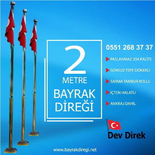 - 2 metre Bayrak Direğinin tepesinde 360 derece rüzgarın yönüne göre dönen bir tepe döner vardır. Bu tepe döner 2 metre bayrağın rüzgarın esmesi ile beraber direği dolanmaması için geliştirilmiştir.