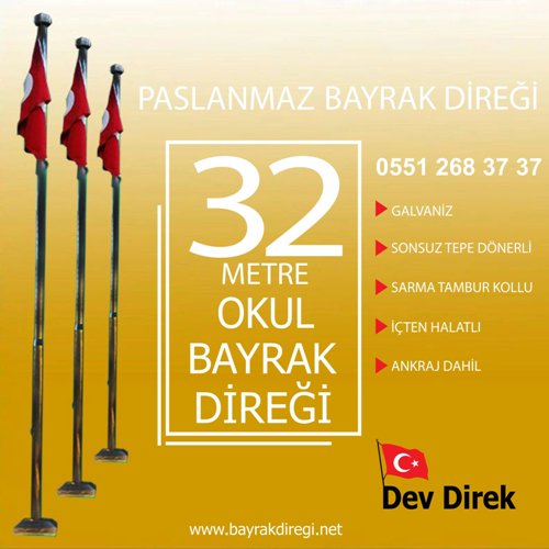 32 Metre Paslanmaz Okul Bayrak Direği imalatında Anaokulu bayrak direği, İlkokul bayrak direği, Ortaokul bayrak direği, Lise bayrak direği, Meslek lisesi bayrak direği, İmam Hatip Lisesi bayrak direği, Fen Lisesi Bayrak direği, Anadolu Lisesi bayrak direği, Spor Lisesi bayrak direği, Güzel Sanatlar Lisesi bayrak direği gibi birçok okulumuza bayrak direği imalatı yapmaktayız.