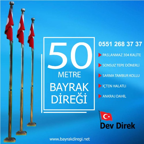 50 Metre Paslanmaz Bayrak Direği üreten Dev Direk olarak bayrak direklerimizde sonsuz tepe döner kullanmaktayız. Paslanmaz ve galvaniz bayrak direklerinin her ikisi için de İçten halatlı ve dıştan halatlı olmak üzere iki tip tasarım yapılmaktadır.